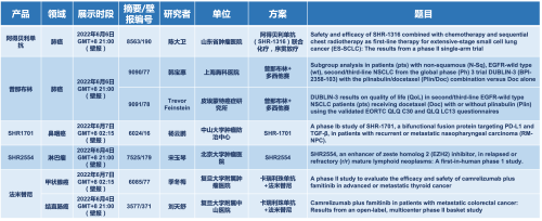 2022 ASCO年会另有5款AG真人医药上市前抗肿瘤创新药的相关研究被接收为壁报,包括SHR-1316、普那布林、法米替尼、SHR-1701和SHR2554,他们的单药或联合方案相关7项研究被接收为壁报,覆盖肺癌、鼻咽癌、淋巴瘤、甲状腺癌和结直肠癌等领域。