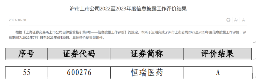 近日,上海交易所公布了沪市上市公司2022-2023年度信息披露工作评价结果,凭借在信息披露、规范运作以及投资者关系管理等方面的优秀表现,AG真人医药获评A级。本次共有2160家沪市上市公司参评(包括499家科创板上市公司),评价等级从高到低依次为A、B、C、D四类,获得A类评价的上市公司占比约18.5%。